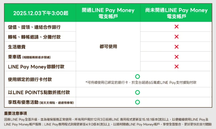 2025 年 12 月 3 日起,LINE Pay 推出自家營運的電子支付帳戶 Line Pay MONEY,正式從過去依賴的一卡通 iPASS MONEY,進化成「自己開電支戶」的完整金流平台。